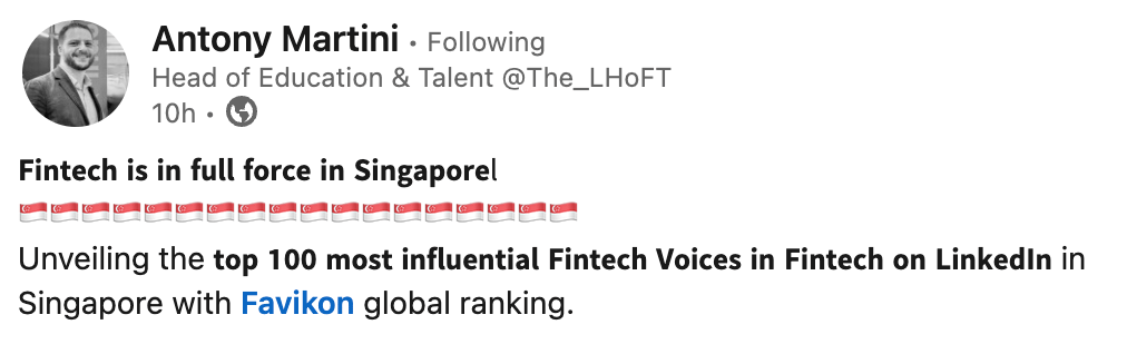 Number 6 on the most influential Fintech voices in FinTech in Singapore on Linkedin.
